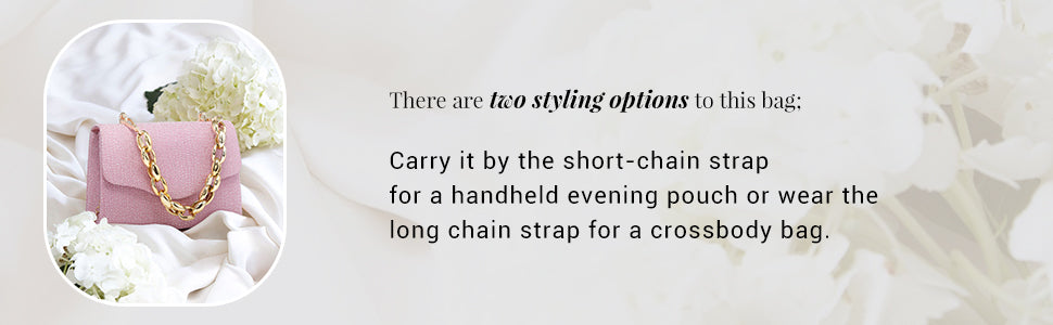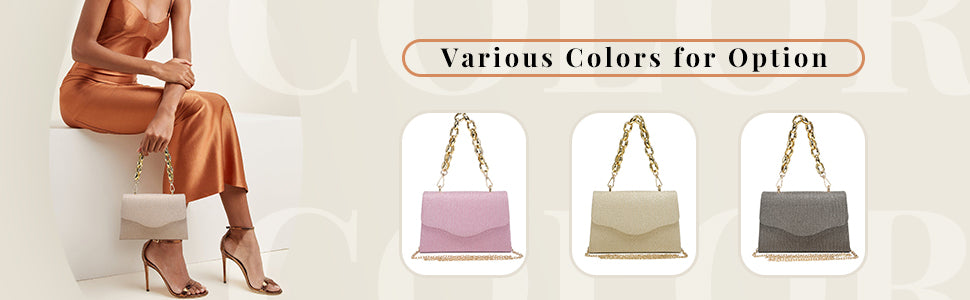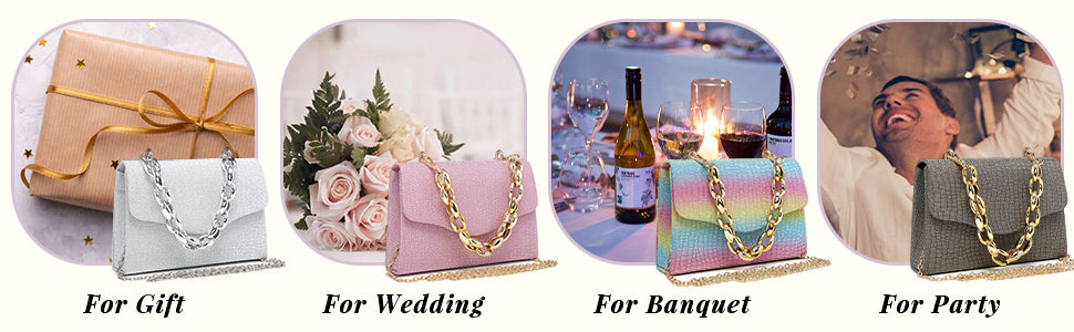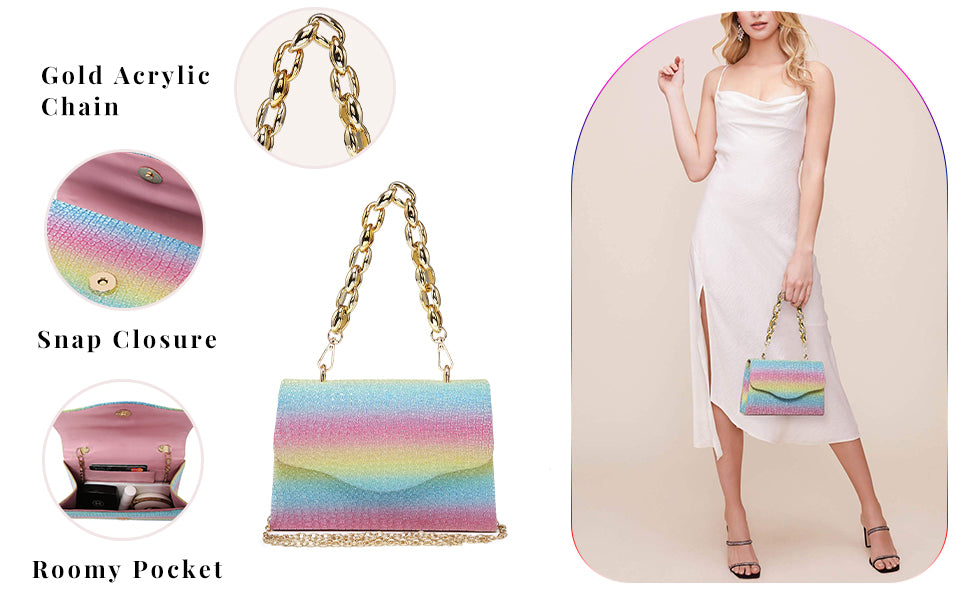 Design: The elegant clutch with 2 chain straps, flap snap closure sparkles up your night. Versatile: Free your hands with detachable hidden-clasp gold chain strap to wear as a crossbody bag or use the gold acrylic chain for a shoulder bag. Size: 7.8"W x 5"H x 1.8"D. 40" Long Chain Strap. 6" Short Chain Strap. Pockets: Lined interior with one back-wall slip pocket- Easily fit a cell phone(large enough to hold iPhone XS max w/ case), wallet mirror, lipstick some daily uses. |