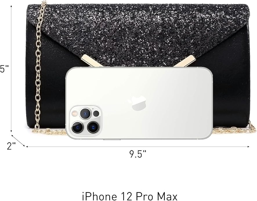 - Features: Glitters in varied sizes on flap; Polished metal hardware; This envelope style evening clutch bag with shiny glitters that will make you glowing during special occasions.
