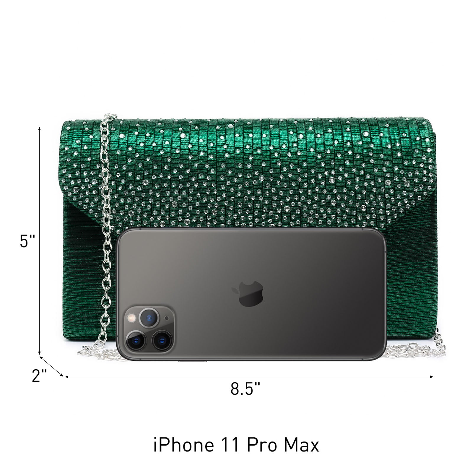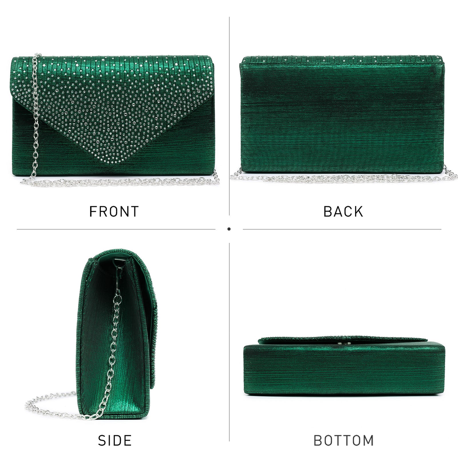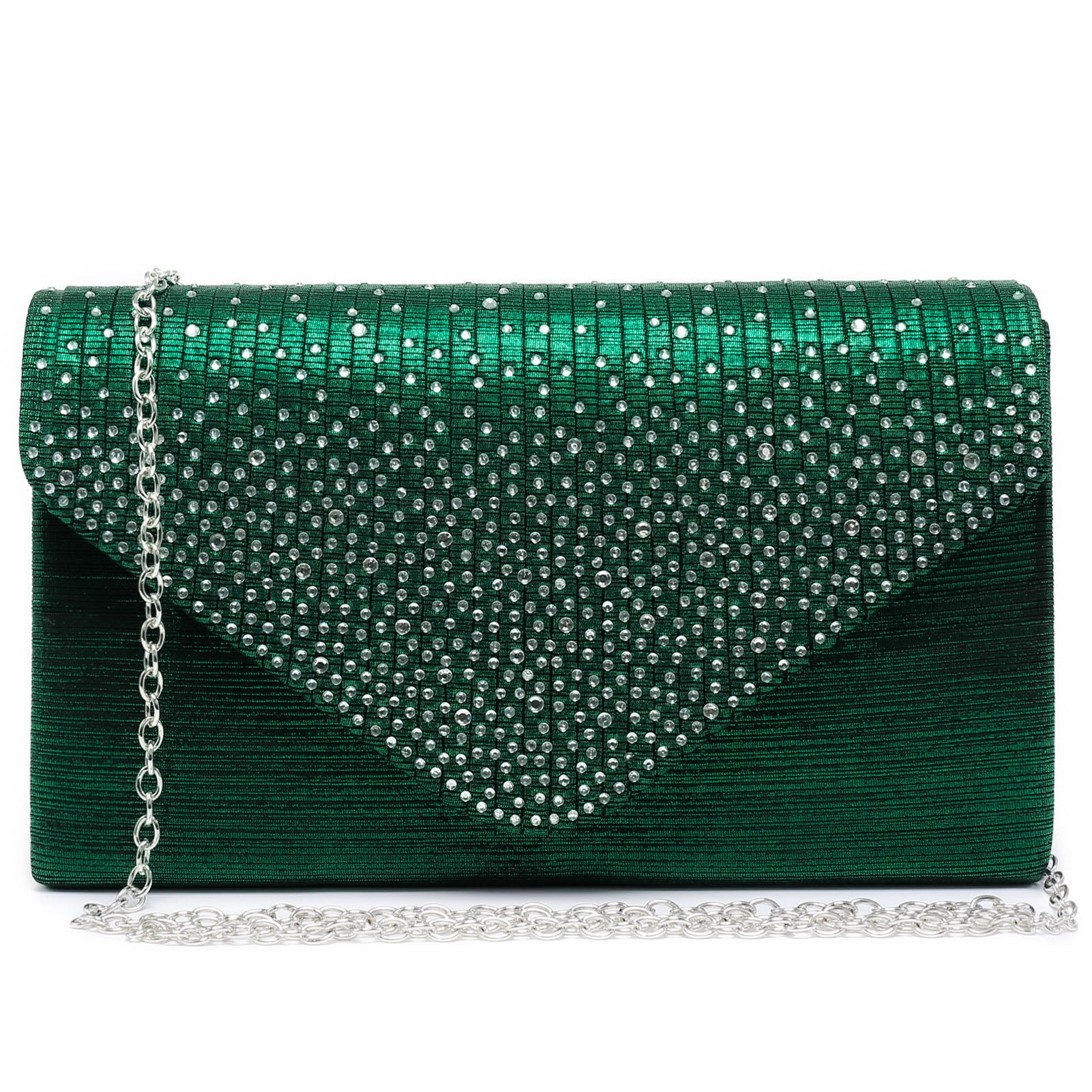- MATERIALS: This women's evening purse is made of high-quality glossy satin, which has a metallic sheen. Subtly pleated flap with varied sizes of rhinestones.