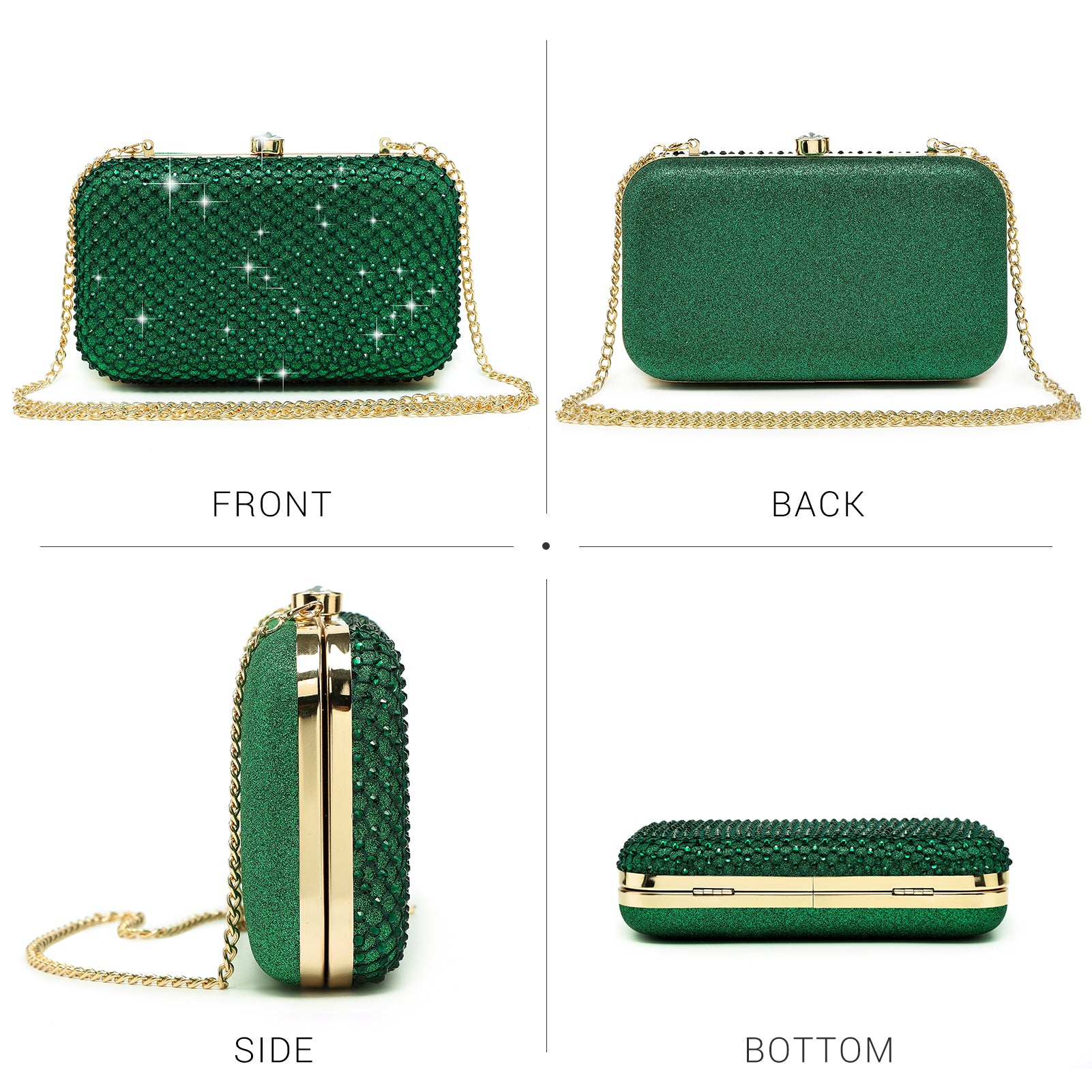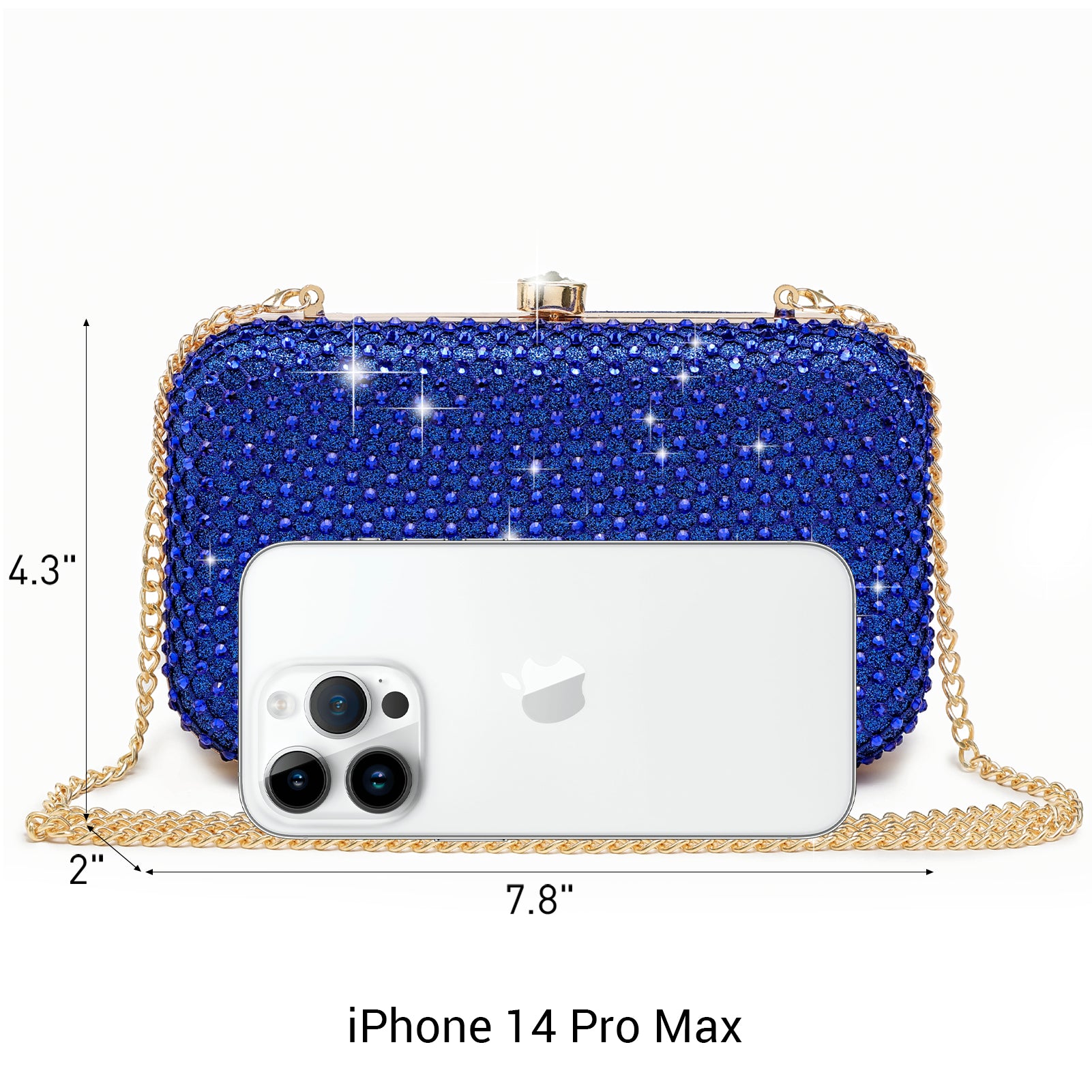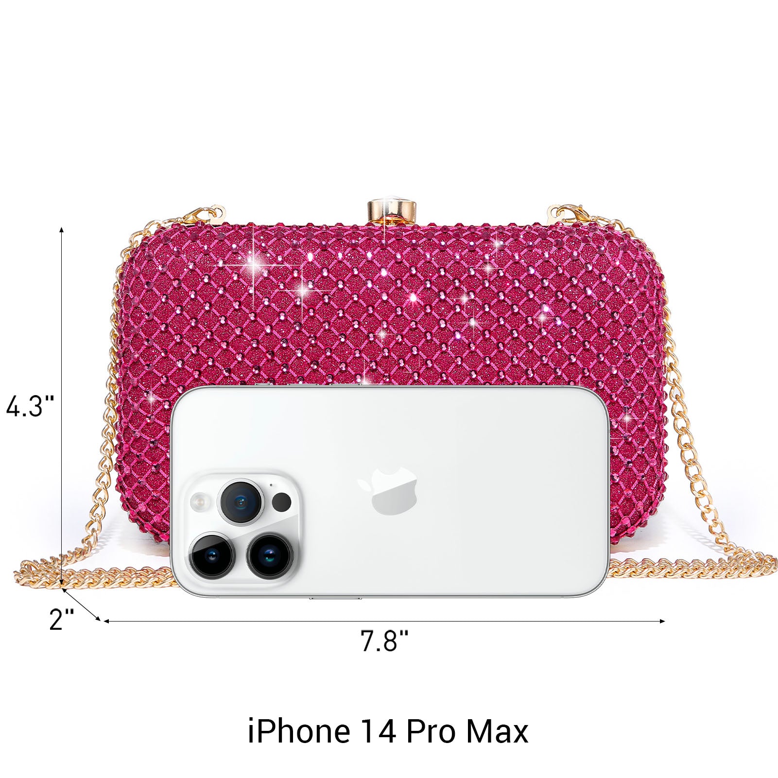 Sparkling Rhinestone ClutchSize: 7.8"W x 2"H x 4.3"D. 40" Chain Strap. Features: The front side is decorated with rhinestone. Embellished with Crystal Clasp. Versatile: Free your hands with detachable hidden-clasp gold chain strap. Pockets: Lined interior - Easily fit a cell phone, lipstick and a pack of gum. |